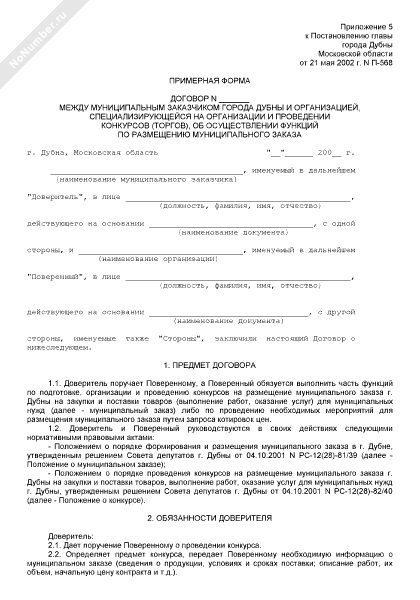 - 790Договор между муниципальным заказчиком города Дубны и организацией, специализирующейся на организации и проведении конкурсов (торгов), об осуществлении функций по размещению муниципального заказа