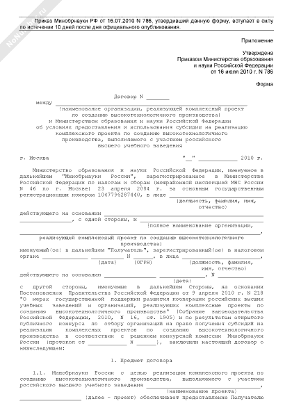 - 796Договор между организацией, реализующей комплексный проект по созданию высокотехнологичного производства и Министерством образования и науки Российской Федерации об условиях предоставления и использования субсидии на реализацию комплексного проекта по созданию высокотехнологичного производства, выполняемого с участием российского высшего учебного заведения
