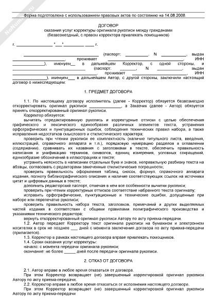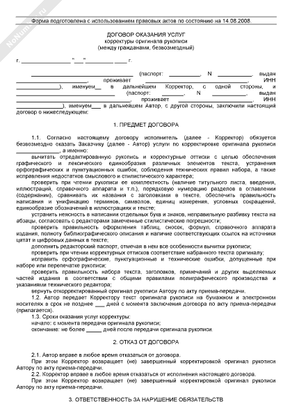 - 1582Договор оказания услуг корректуры оригинала рукописи (между гражданами, безвозмездный)