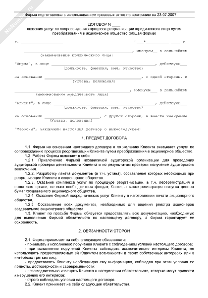 - 1588Договор оказания услуг по сопровождению процесса реорганизации юридического лица путем преобразования в акционерное общество (общая форма)