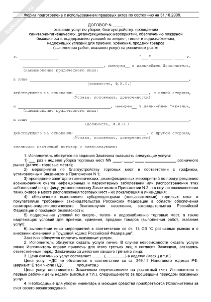 - 1594Договор оказания услуг по уборке, благоустройству, проведению санитарно-гигиенических, дезинфекционных мероприятий, обеспечению пожарной безопасности, поддержанию условий по энерго-, тепло- и водоснабжению, надлежащих условий для приемки, хранения, продажи товаров (выполнения работ, оказания услуг) на розничном рынке