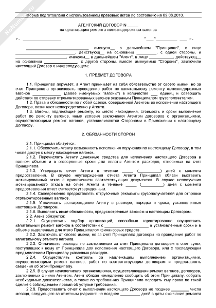 Агентский договор на организацию ремонта железнодорожных вагонов (рекомендуемый образец заполнения)