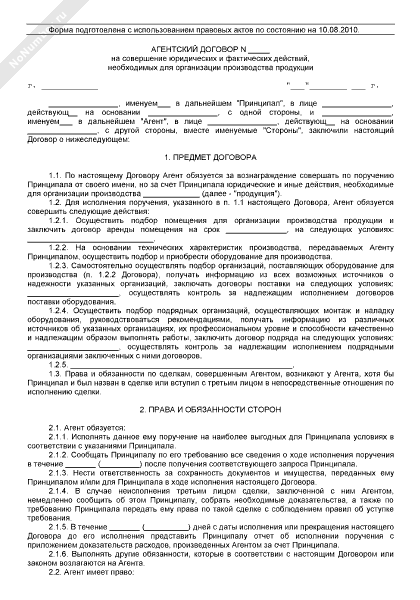Агентский договор на совершение юридических и фактических действий, необходимых для организации производства продукции (агент действует от своего имени, но за счет принципала)