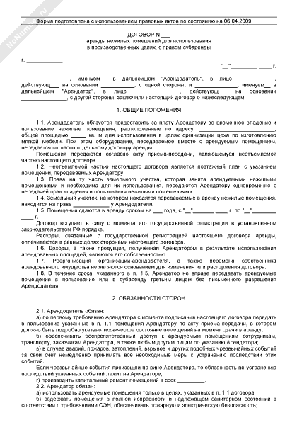 Договор аренды нежилых помещений для использования в производственных целях, с правом субаренды (рекомендуемый образец заполнения)