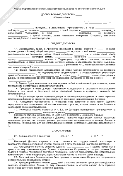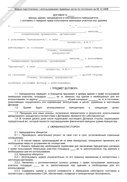 Договор аренды здания, находящегося в собственности арендодателя, с условием о передаче права пользования земельным участком под зданием (рекомендуемый образец заполнения)