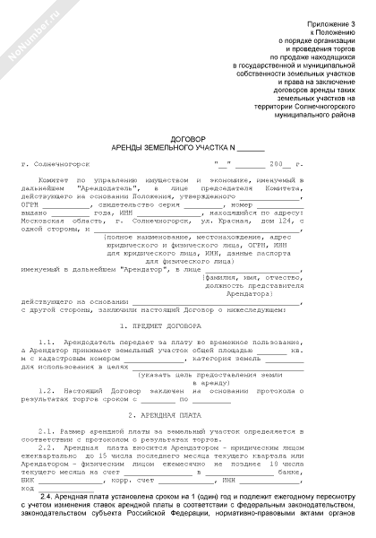 Договор аренды земельного участка, заключенный на основании протокола о результатах открытых торгов на право заключения договора аренды земельного участка на территории Солнечногорского муниципального района Московской области (рекомендуемый образец заполнения)