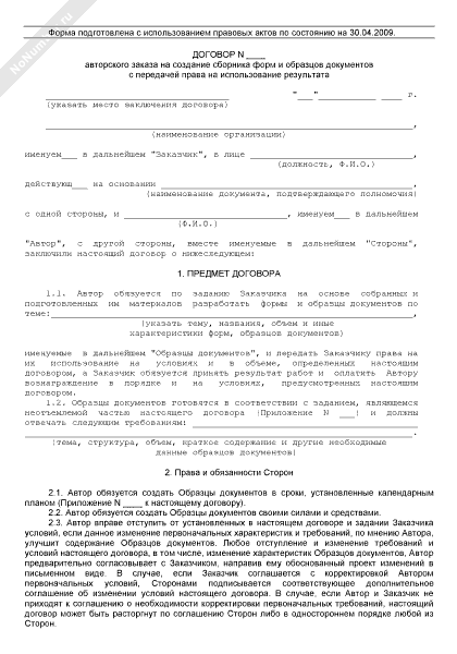 Договор авторского заказа на создание сборника форм и образцов документов с передачей права на использование результата (рекомендуемый образец заполнения)