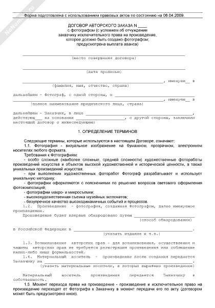 Договор авторского заказа с фотографом (с условием об отчуждении заказчику исключительного права на произведение, которое должно быть создано фотографом; предусмотрена выплата аванса)