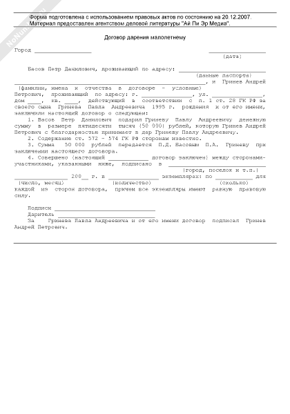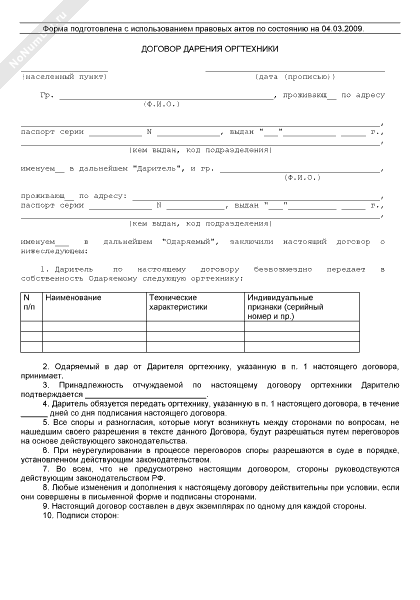 Договор дарения оргтехники (рекомендуемый образец заполнения)