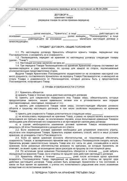 Договор хранения товара (передача товара по актам приемки-передачи)