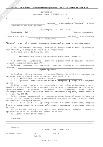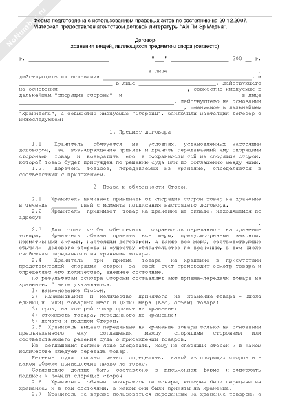 Договор хранения вещей, являющихся предметом спора (секвестр)