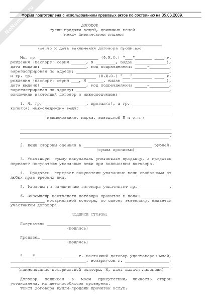 Договор купли-продажи движимых вещей (между физическими лицами)