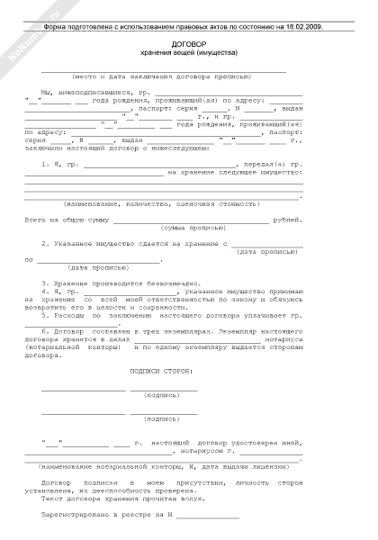 Договор хранения вещей, являющихся предметом спора (секвестр)