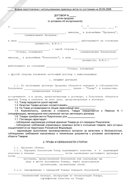 Договор купли-продажи товара (с условием об ассортименте)