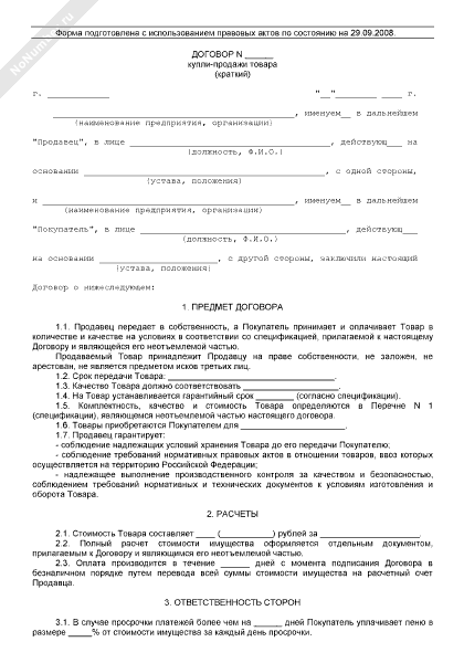 Договор купли-продажи товара (краткий)