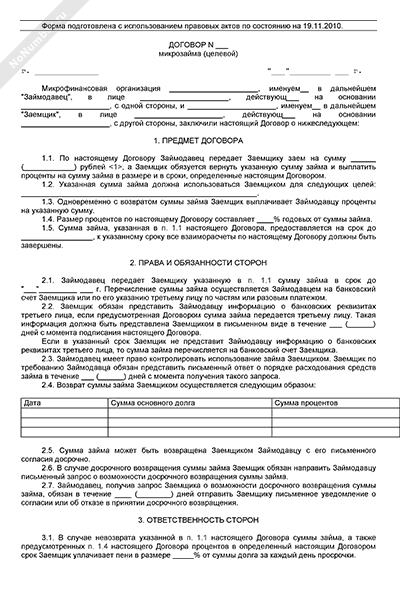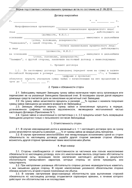 Договор микрозайма (рекомендуемый образец заполнения)