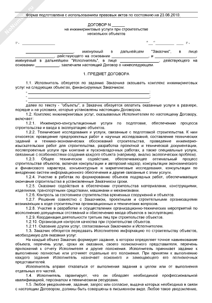 Договор на инжиниринговые услуги при строительстве нескольких объектов (рекомендуемый образец заполнения)