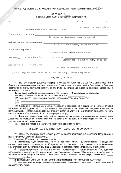 Договор на выполнение работ с передачей оборудования (рекомендуемый образец заполнения)