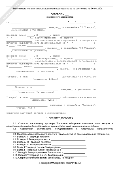 Договор негласного товарищества (рекомендуемый образец заполнения)