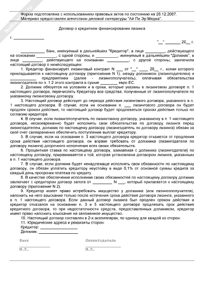 Договор о кредитном финансировании лизинга (рекомендуемый образец заполнения)