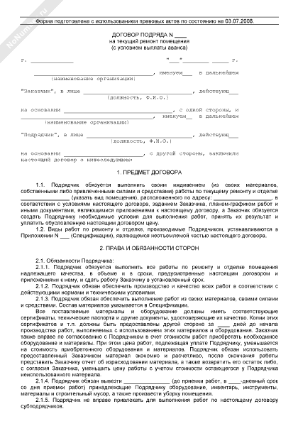 Договор подряда на текущий ремонт помещения (с условием выплаты аванса)