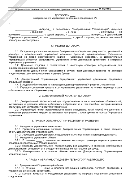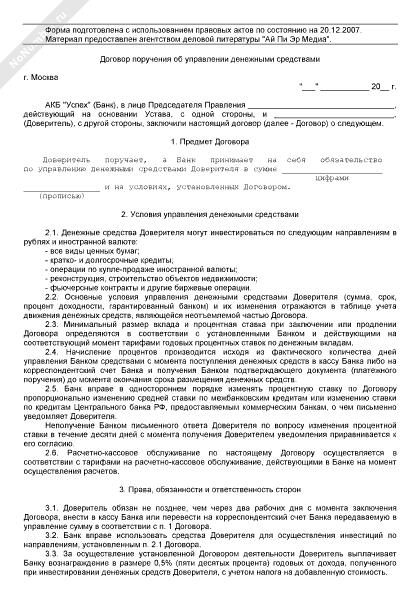 Договор поручения об управлении денежными средствами (рекомендуемый образец заполнения)