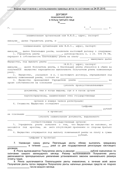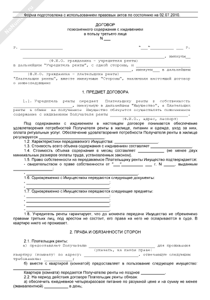 Договор пожизненного содержания с иждивением в пользу третьего лица (рекомендуемый образец заполнения)