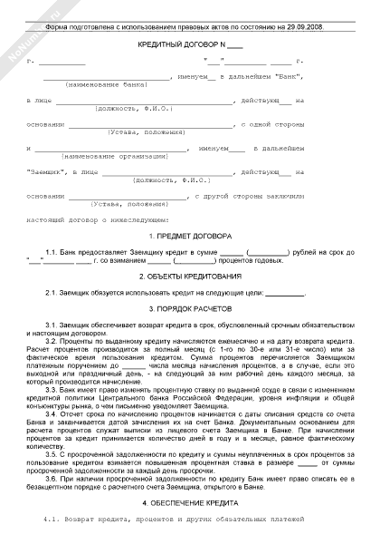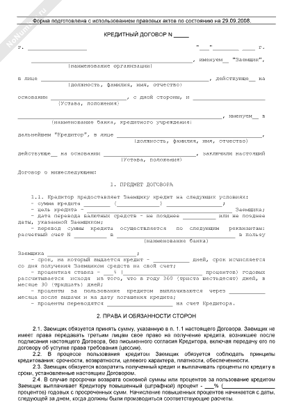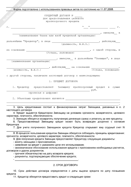 Кредитный договор для предоставления целевого краткосрочного кредита