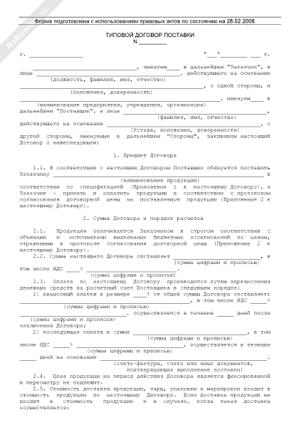 Типовой договор поставки (рекомендуемый образец заполнения)