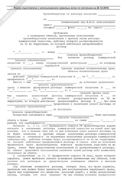 Требование о возмещении убытков, причиненных пользователю правообладателем заключением с третьим лицом договора коммерческой концессии, действие которого распространяется на ту же территорию, на которой действовал прекратившийся договор (рекомендуемый образец заполнения)