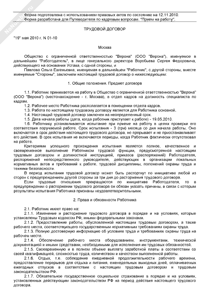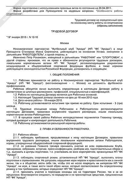 Трудовой договор на определенный срок по основному месту работы со спортсменом (рекомендуемый образец заполнения)