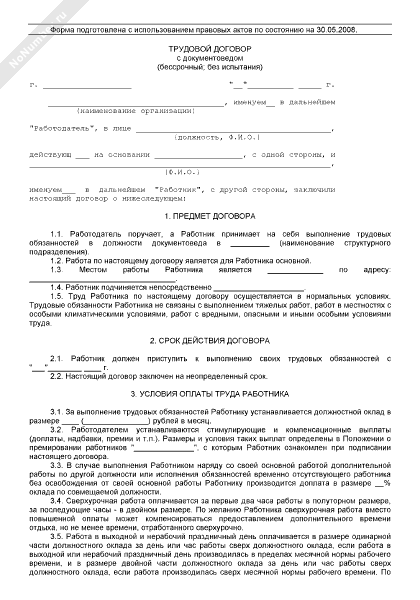 Трудовой договор с документоведом (бессрочный; без испытания)