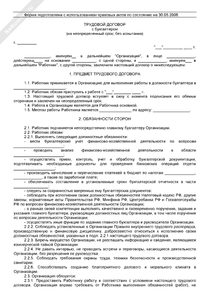Трудовой договор с бухгалтером (на неопределенный срок; без испытания)