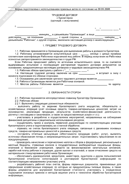 Трудовой договор с бухгалтером (срочный; с испытанием)