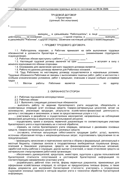 Трудовой договор с бухгалтером (срочный; без испытания)