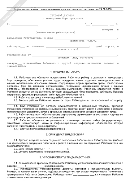 Трудовой договор с заведующим бюро пропусков