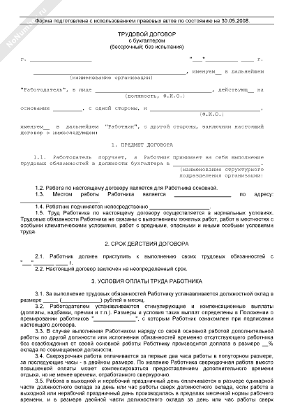 Трудовой договор с бухгалтером (бессрочный; без испытания)