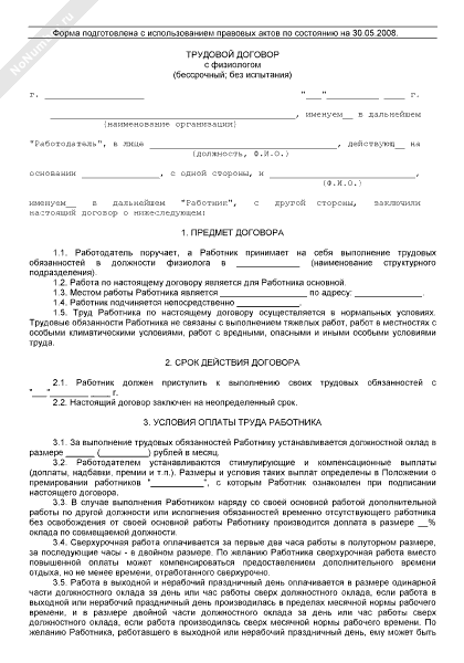 Трудовой договор с физиологом (бессрочный; без испытания)