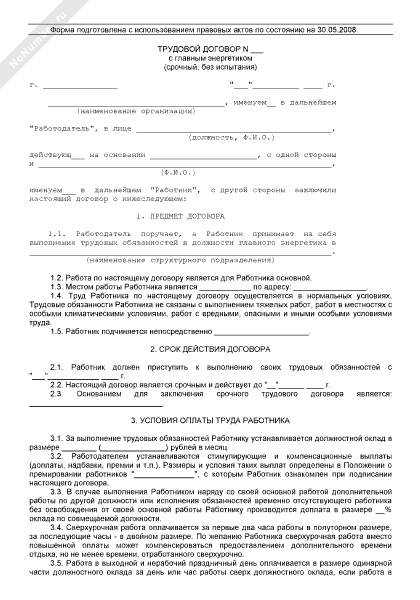 Трудовой договор с главным энергетиком (срочный; без испытания)