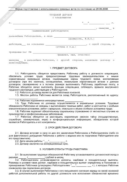 Трудовой договор с кладовщиком