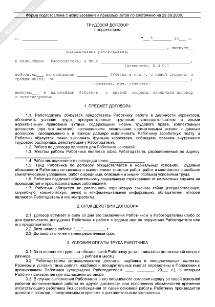 Трудовой договор с корректором (рекомендуемый образец заполнения)