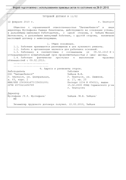 Трудовой договор с работником, фактически приступившим к выполнению трудовых обязанностей (рекомендуемый образец заполнения)