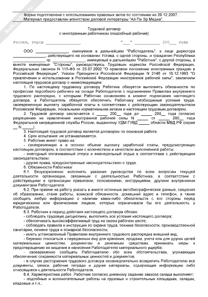 Трудовой договор с иностранным работником (подсобный рабочий)