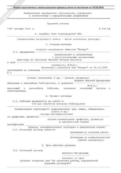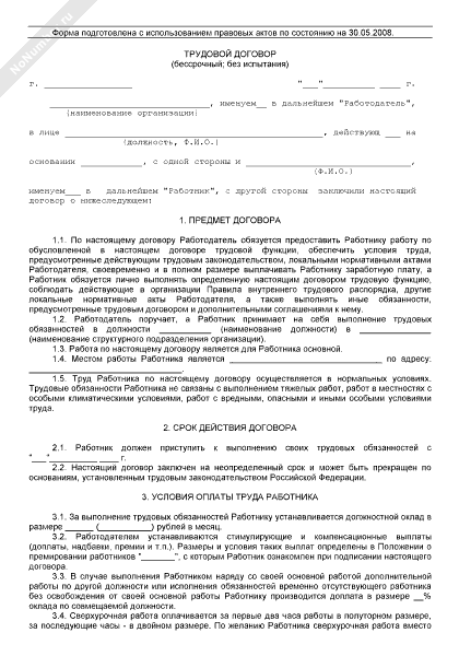 Трудовой договор с работником (бессрочный; без испытания)