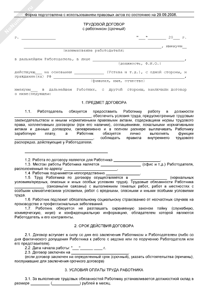 Трудовой договор с работником (срочный)