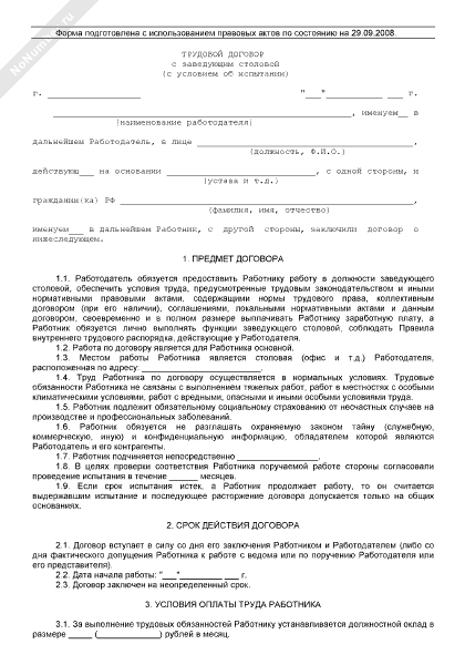 Трудовой договор с заведующим столовой (с условием об испытании)