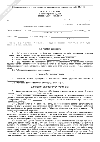 Трудовой договор с инспектором по кадрам (бессрочный; без испытания)