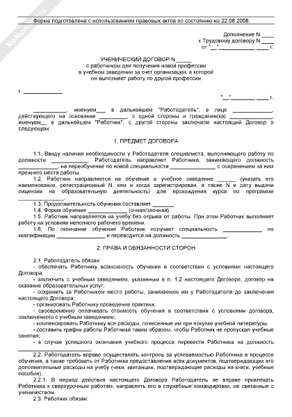 Ученический договор с работником для получения новой профессии в учебном заведении за счет организации, в которой он выполняет работу по другой профессии (дополнение к трудовому договору)