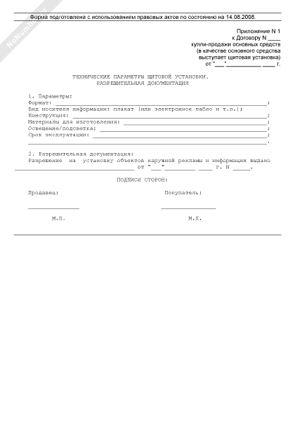 Технические параметры щитовой установки. Разрешительная документация (приложение к договору купли-продажи основных средств (в качестве основного средства выступает щитовая установка))