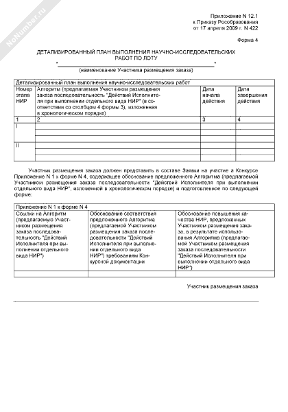 Конкурсная документация открытого конкурса (многолотовая) на выполнение научно-исследовательских работ по проекту, проводимому в рамках реализации федеральных целевых, государственных и иных программ в сфере образования, воспитания и развития общедоступных образовательных ресурсов. Формы документов, представляемых участником размещения заказа в составе заявки на участие в конкурсе по лоту. Детализированный план выполнения научно-исследовательских работ (форма № 4)